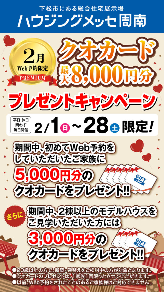 ハウジングメッセ周南では、最大 8,000円分のクオカードがもらえる